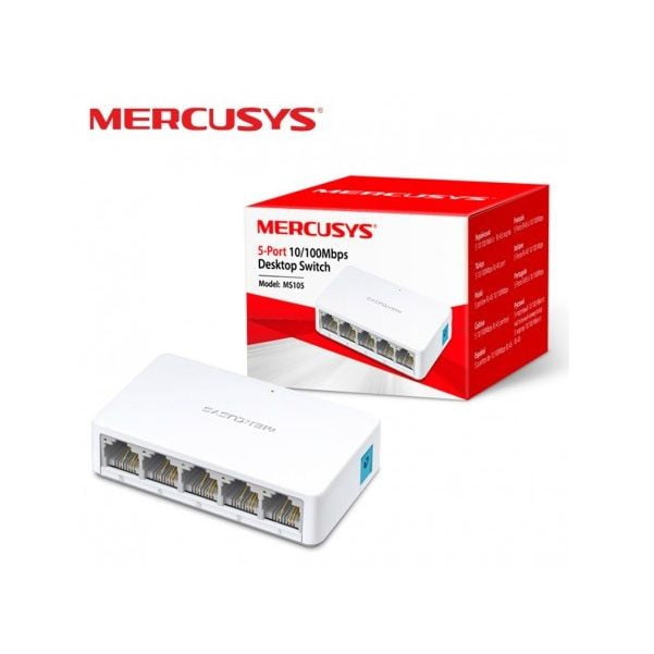 یکی از محصولات شرکت مرکوسیس (MERCUSYS) سوئیچ ۵ پورت مدل MS105 است. این سوئیچ ارتباط با حداکثر سرعت ۱۰۰ مگابیت بر ثانیه را بر روی هر پورت خود پشتیبانی مینماید این محصول به صورت کوچک و سبک طراحی شده و به این ترتیب انعطافپذیری بالایی در چیدمان محیط کار به شما خواهد داد. با توجه به مشخصات و قیمت پایین این محصول برای کسب و کارهای کوچک بسیار مناسب بوده و به کمک این محصول میتوانید به راحتی شبکه محلی باسیم خود را ایجاد نمایید و در این مسیر نیاز به هیچگونه تنظیمات اضافهای نخواهید داشت در این محصول از تکنولوژی اترنت سبز استفاده شده و میتواند تا ۸۲ درصد در مصرف انرژی صرفهجویی کند.