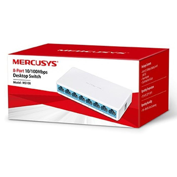 بکی از محصولات شرکت مرکوسیس (MERCUSYS) سوئیچ ۸ پورت مدل MS108 است. این سوئیچ ارتباط با حداکثر سرعت ۱۰۰ مگابیت بر ثانیه را بر روی هر پورت خود پشتیبانی مینماید.